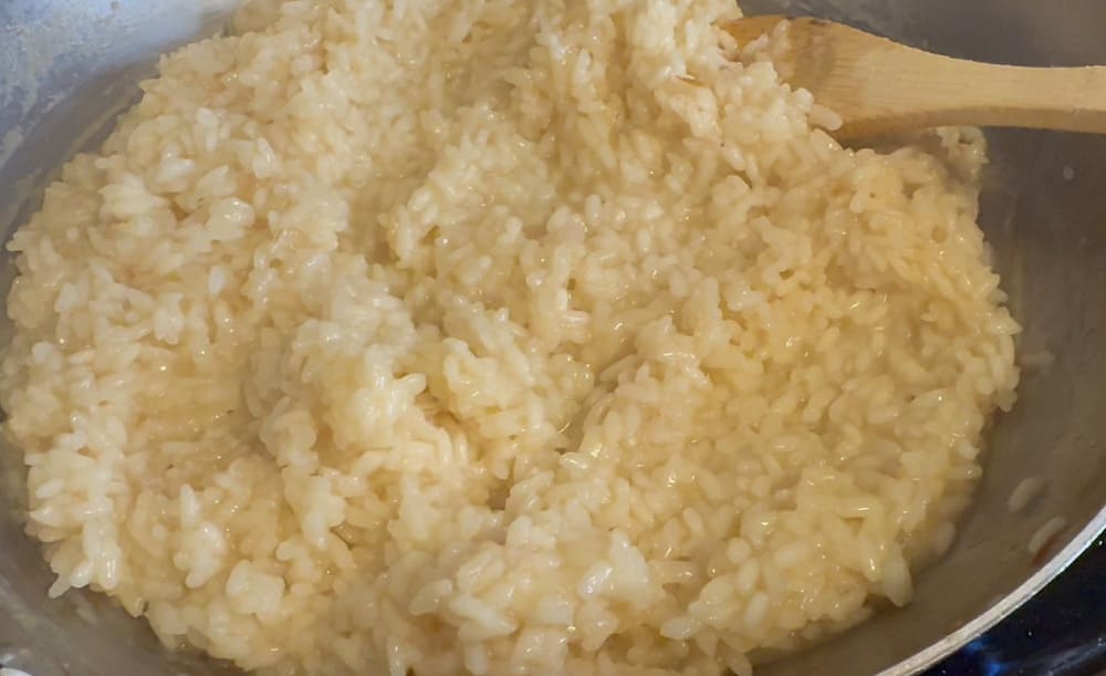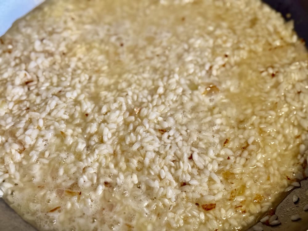 - Stir in the Arborio rice and cook for 1–2 minutes, stirring frequently, until the grains are lightly toasted and coated with oil or butter.