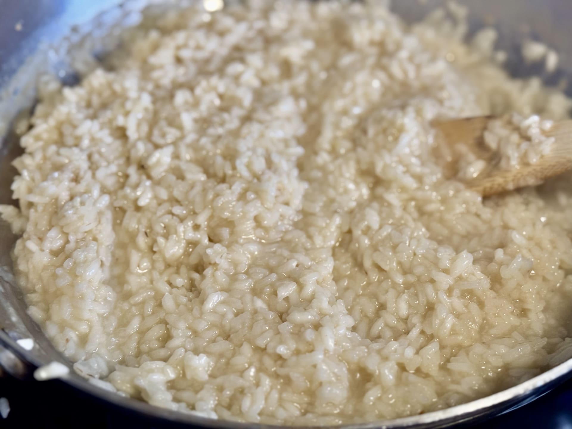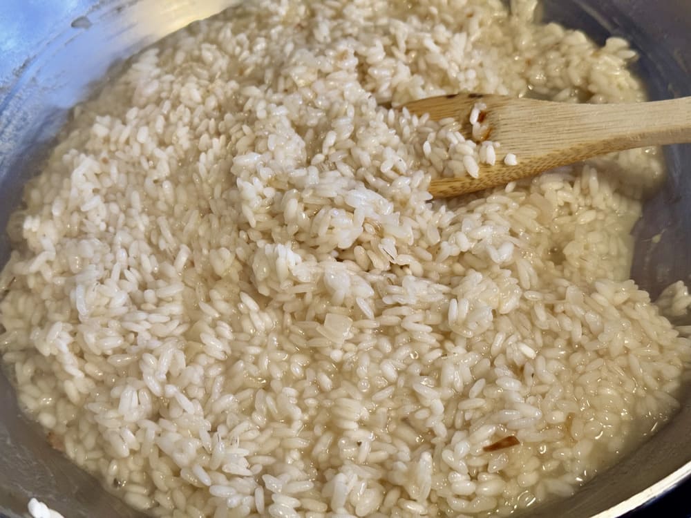 - Pour in the Champagne and stir until it’s mostly absorbed by the rice.