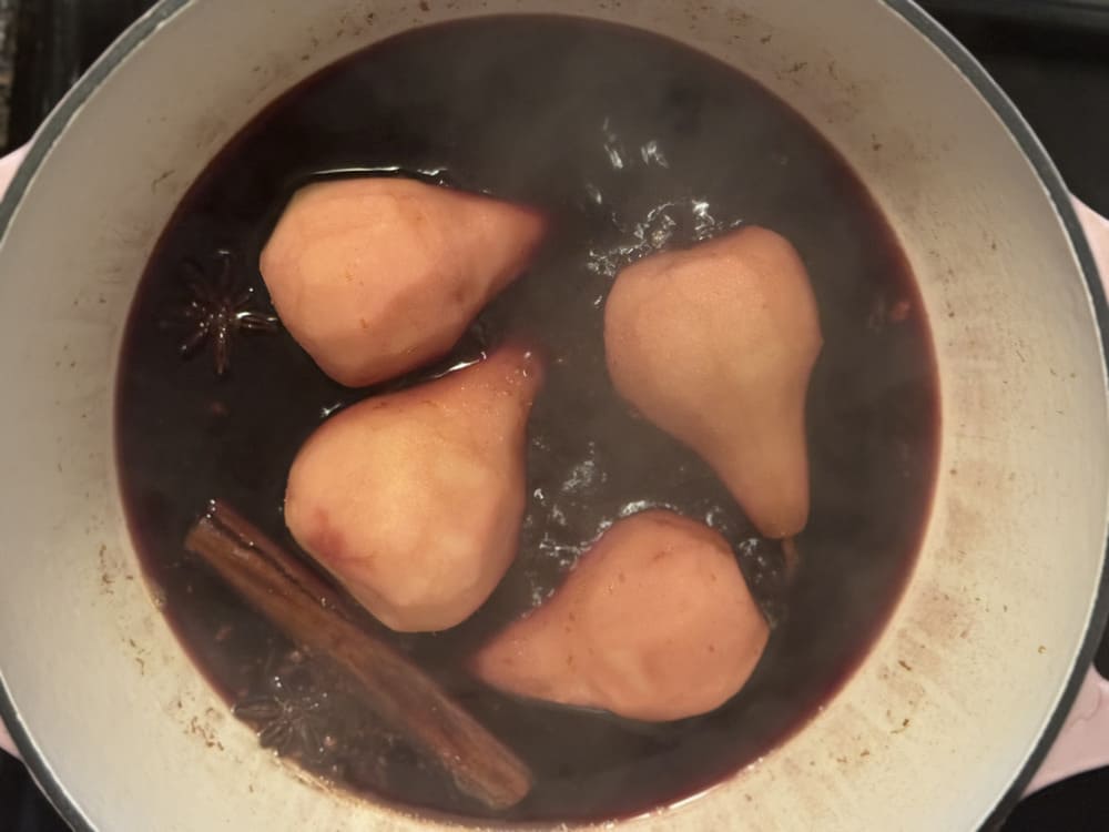 - Poach the Pears: Add the pears to the liquid, ensuring they’re mostly submerged. Simmer on low heat for 20–30 minutes, turning occasionally, until the pears are tender and deeply colored.