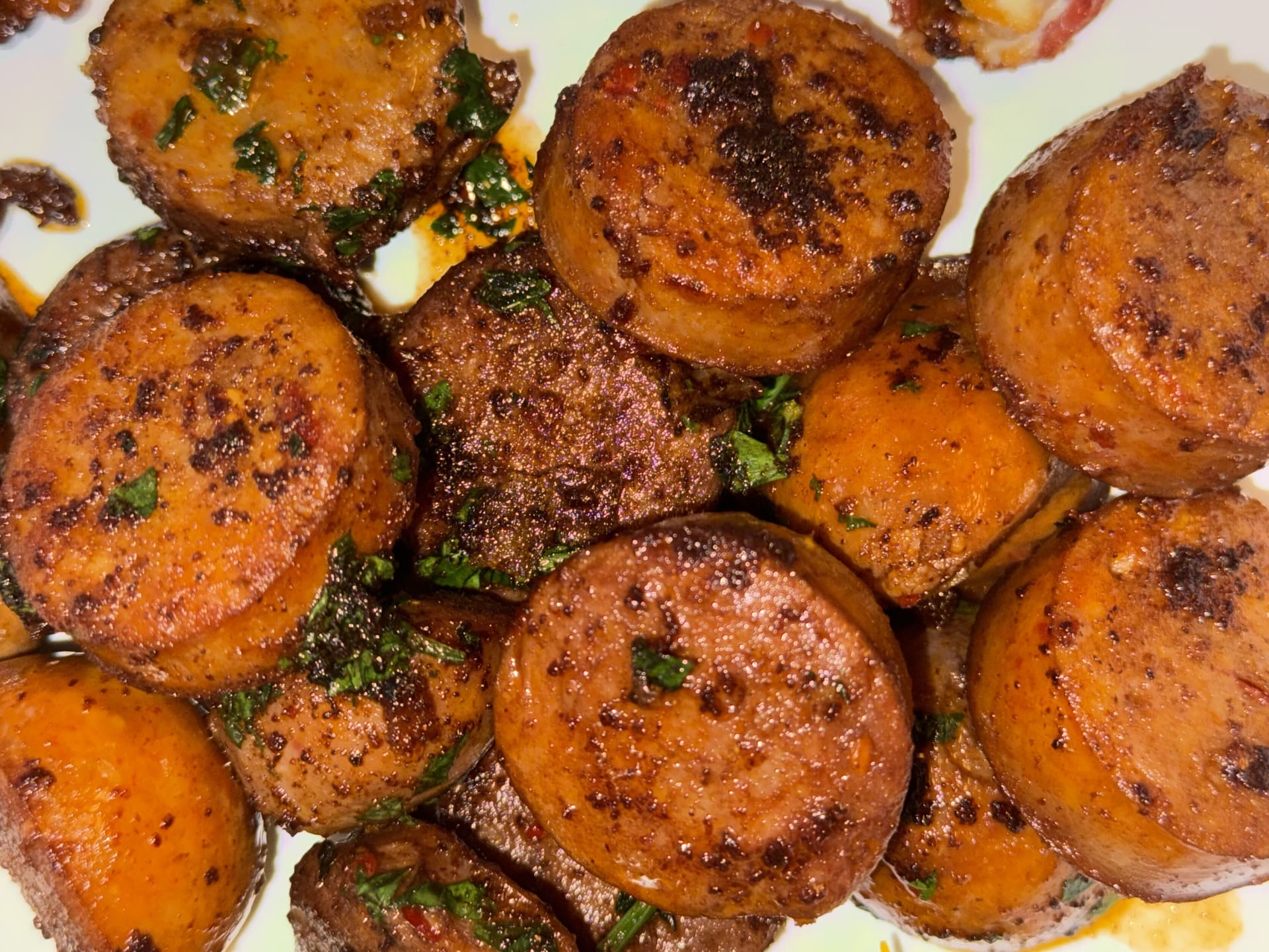 Once the chorizo is cooked to your liking, remove it from the heat. Transfer the slices to a serving plate and sprinkle generously with freshly chopped parsley. The parsley adds a vibrant pop of color and a refreshing contrast to the rich flavors of the chorizo. - Serve and Enjoy